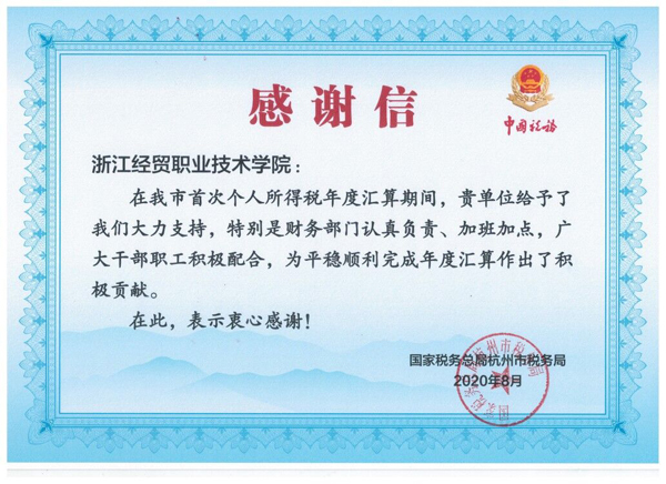 近日,学校收到国家税务总局杭州市税务局发来的感谢信,对我校在杭州市税务局首次个人所得税汇算期间给予的大力支持表示感谢。
