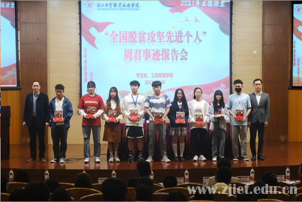 报告会邀请了“全国脱贫攻坚先进个人”、杭州联华华商集团有限公司总经理助理周君女士。学工部部长、学生处处长邱雷鸣,工商管理学院党总支书记、院长张西华,学生处、团委、工商管理学院相关负责人和教师代表、资助辅导员、学生资助对象代表、“温心之家”全体成员等400余人出席了会议。报告会由学工部副部长潘丽萍主持。