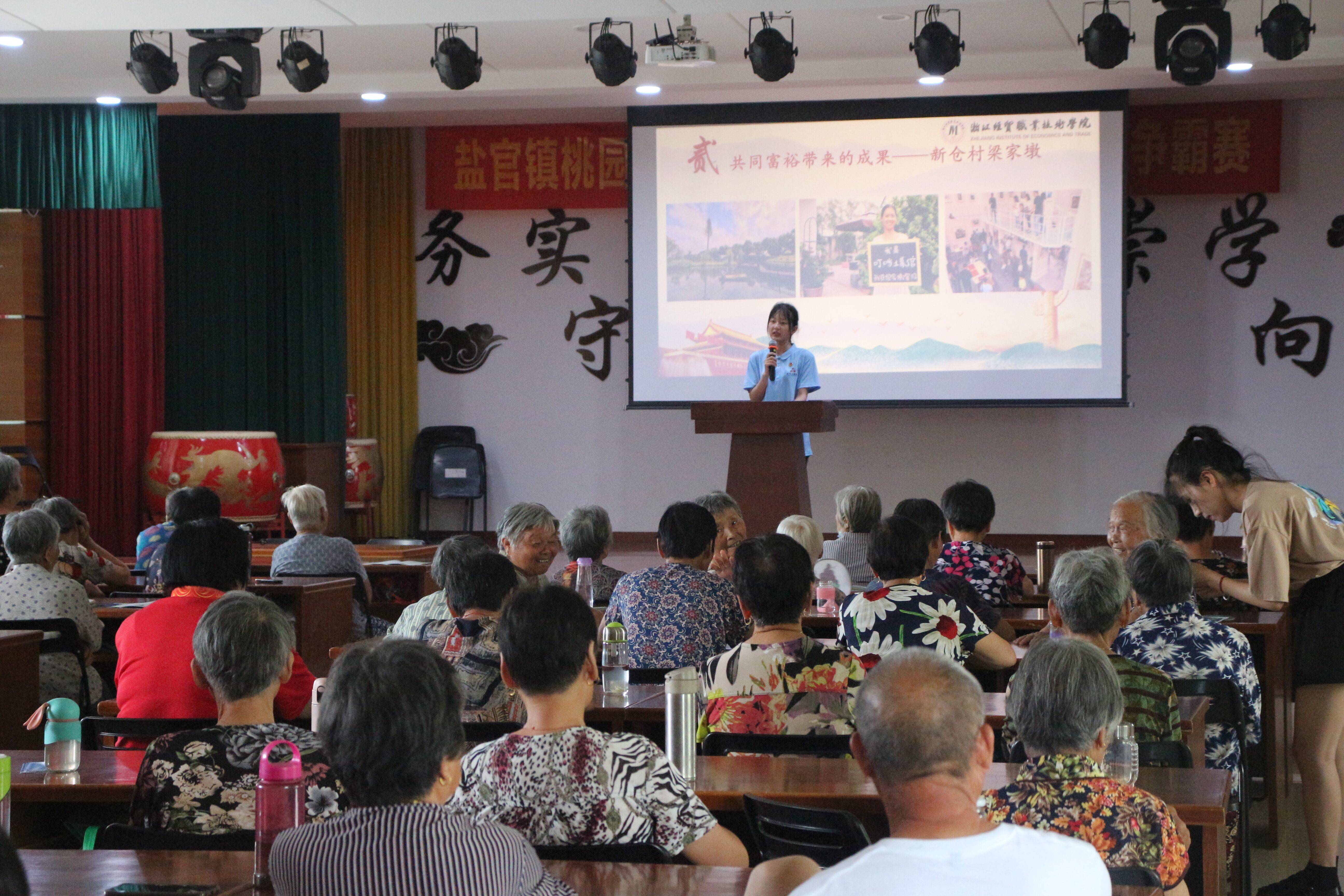 探索海宁的共富路径也是此行的重要内容。实践团队来到海宁市2022年度五星级共同富裕村——桃园村。在村史馆和塔莎园艺农业示范园,实践团队了解到“互联网+农业+旅游”这种“造血式”的新产业模式。在桃园村文化大礼堂,实践团队开展了“匠心助老,携手创共富”主题活动,为村民普及了共同富裕、食品安全和防诈骗相关知识。在与村民的互动中,成员们真切感受到“共同富裕”浙江解法真正惠及了普通民众,让老百姓不仅“腰包鼓起来”,精神上也跟着富了起来。