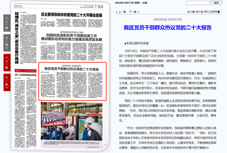 10月16日,中国共产党第二十次全国代表大会在北京开幕。大会引起了我区广大党员干部群众的广泛关注和热烈反响。大家第一时间学习党的二十大报告,纷纷表示,要弘扬伟大建党精神,踔厉奋发、勇毅前行、团结奋斗,在新时代新征程中谱写更加绚丽的时代华章。