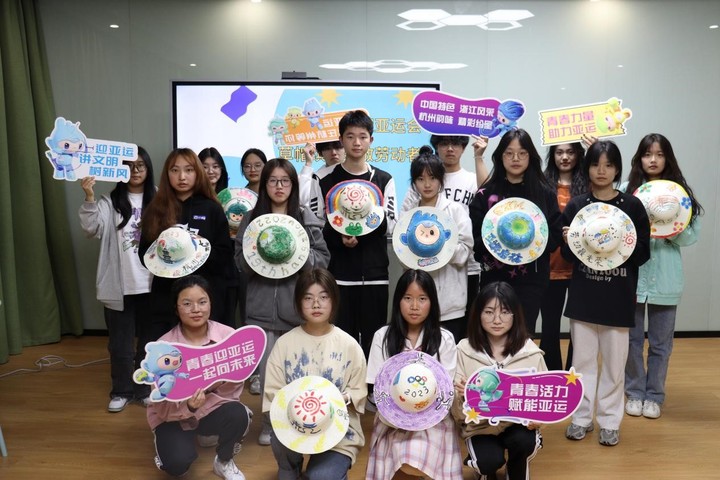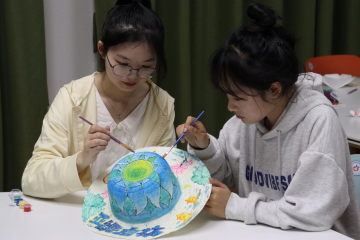 同学们把“亚运启杭”、“劳动最光荣”等口号和杭州地标、亚运元素图案相结合,用五彩颜料上色涂染,创作出一顶顶独具匠心、色彩缤纷的草帽。